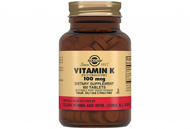 Солгар Витамин К 100мкг таблетки N100 Таблетки Витамин К1 (фитоменадион) 100 мкг рекомендуются в качестве дополнительного источника витамина К. Основная функция витамина К1 в организме — обеспечение нормального свертывания крови. Недостаточное содержание витамина К1 в организме повышает риск развития кровотечений. Поэтому витамин К1 назначают при подготовке к хирургическим операциям для предотвращения кровотечений. Помимо процессов свертывания крови витамин К участвует в поддержании проницаемости и прочности сосудистой стенки, ускоряет заживление ран. В организм витамин К поступает в основном с пищей. Богаты витамином К брюссельская и цветная капуста, листья шпината, плоды шиповника.