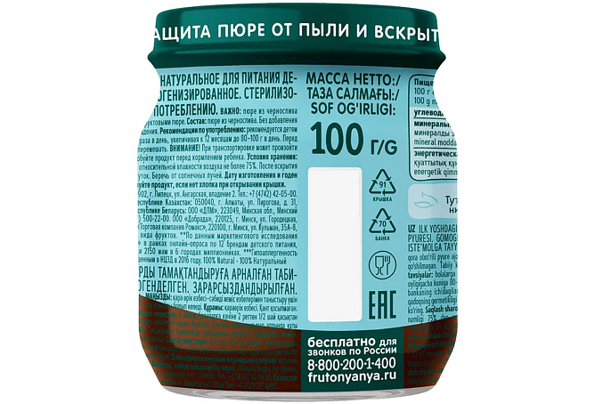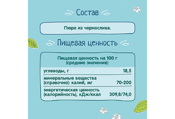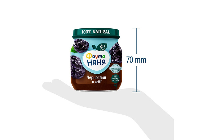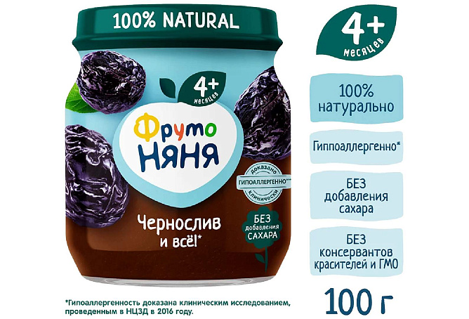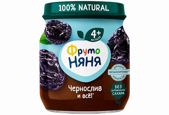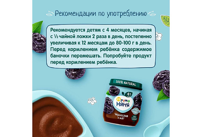 Пюре из чернослива поможет разнообразить рацион ребенка на первом году жизни. Продукт подходит для первого прикорма детей в возрасте с 4 месяцев. Натуральный чернослив в составе помогает улучшить пищеварение. Детское пюре из чернослива «ФрутоНяня» гипоаллергенно, и это доказано клинически. В его составе только натуральные компоненты — пюре из отборного чернослива без добавления сахара. Открытую стеклянную баночку необходимо хранить в холодильнике.