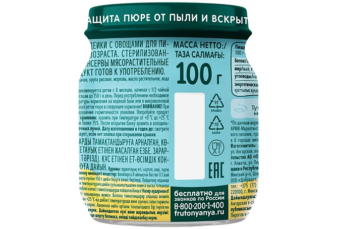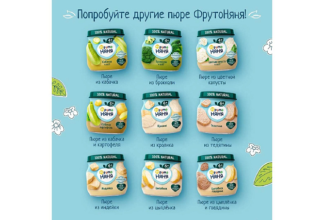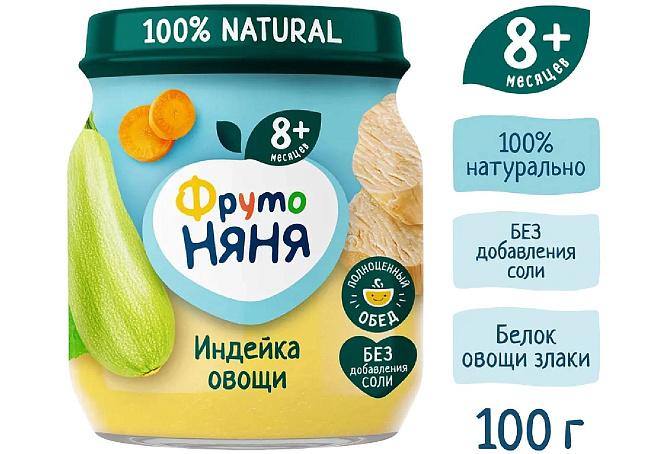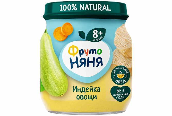 Пюре «ФрутоНяня» из индейки с овощами — сочетание вкусов любимых овощей и мяса индейки, которое поможет разнообразить рацион ребенка от 8 месяцев. Мясо-растительное пюре «ФрутоНяня» — источник белка, витаминов и минеральных веществ для полноценного роста и развития вашего малыша. В составе только натуральные компоненты: мясо индейки, картофель, кабачок, морковь. Пюре не только вкусное и полезное, но и сытное. Поэтому подходит в качестве полноценного приема пищи — например, на обед или ужин.