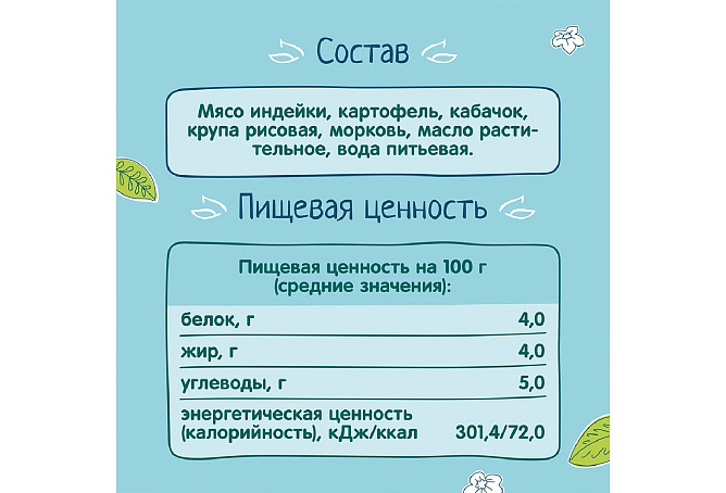 Мясо индейки, картофель, кабачок, крупа рисовая, морковь, масло растительное, вода питьевая.