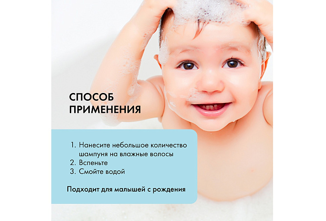 Нанести небольшое количество шампуня на влажные волосы, вспенить, смыть водой. Подходит для малышей с рождения.