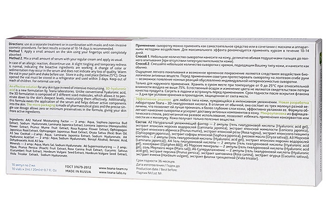 A2 «Натуральный увлажняющий фактор» — 2 ампулы (гель гиалуроновой кислоты (Hyaluronic acid gel), экстракт японских морских водорослей (Laminaria Japonica), экстракт японской жимолости (Lonicera Japonica), экстракт японского абрикоса (Prunus Mume), экстракт японской розы (Rosa Rugosa), экстракт японского гиацинта (Ophiopogon Japonicus), экстракт софоры японской (Sophora Japonica), рисовое масло (Oryza Sativa)); A3 «Морской коктейль» — 2 ампулы (Гель гиалуроновой кислоты (hyaluronic acid gel), экстракт японских морских водорослей (Laminaria Japonica)); A4 «Гель гиалуроновой кислоты» — 2 ампулы (Гель гиалуроновой кислоты (hyaluronic acid gel), консервант (Optiphen BD)); A5 «Морские минералы» — 2 ампулы (Гель гиалуроновой кислоты (Hyaluronic acid gel), соль Мертвого моря (Maris sal)); A6 «Суперувлажнение» — 2 ампулы (Гель гиалуроновой кислоты (Hyaluronic acid gel), экстракт персика (Prunus Persica), экстракт шиповника (Rosa Canina), экстракт огурца (Cucumis Sativus), экстракт ячменя (Hordeum Vulgare), экстракт фиалки трехцветной (Viola tricolor)). Ingredients: A2 Natural Moisturizing Factor — 2 amp.: Aqua, Sophora Japonica Bud Extract, Sodium Hyaluronate, Laminaria Japonica Extract, Lonicera Japonica (Honeysuckle) Flower Extract, Prunus Mume Fruit Extract, Rosa Rugosa Flower Extract, Ophiopogon Japonicus Root Extract, Ophiopogon Japonicus Root Extract, Oryza Sativa (Rice) Bran Oil. A3 Sea Cocktail —2 amp.: Aqua, Laminaria Japonica Extract, Sodium Hyaluronate. A4 Hyaluronic Acid Gel — 2 amp.: Aqua, Sodium Hyaluronate, Benzyl Alcohol, Benzoic Acid, Dehydroacetic Acid. A5 Sea Minerals — 2 amp.: Aqua, Maris Sal, Sodium Hyaluronate. A6 Supermoisturizing — 2 amp.: Aqua, Prunus Persica (Peach) Fruit Extract, Rosa Canina Fruit Extract, Cucumis Sativus (Cucumber) Fruit Extract, Hordeum Vulgare Seed Extract, Hordeum Vulgare Seed Extract, Viola Tricolor Extract, Sodium Hyaluronate.