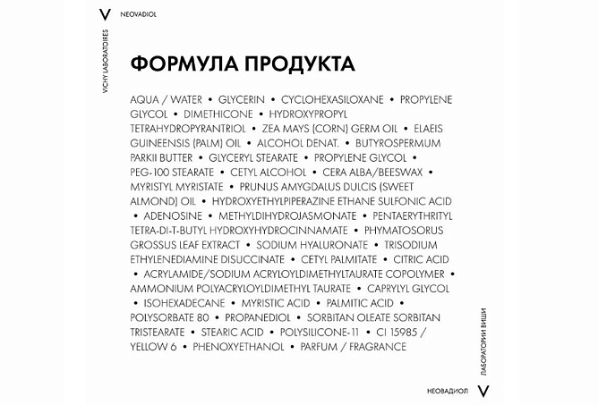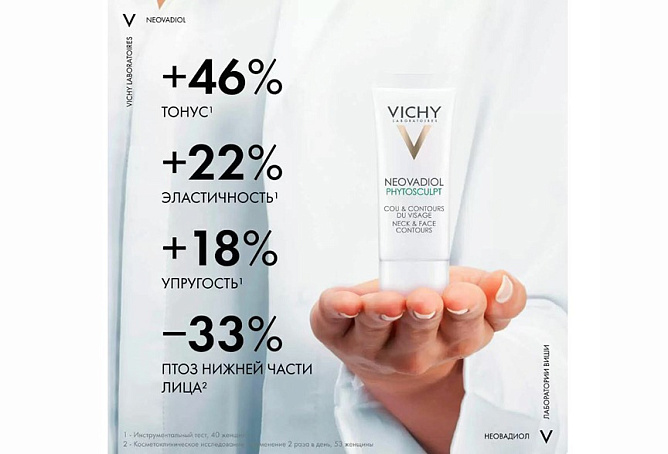 • Neovadiol Phyto Sculpt – первый* антивозрастной, укрепляющий крем VICHY для кожи в период менопаузы – заметно укрепляет, подтягивает и ремоделирует контуры лица и шеи. Текстура бальзама тает при контакте с кожей, напитывая эпидермис влагой, а после превращается в пленку, которая укрепляет и повышает упругость кожи. Подходит для всех типов кожи, включая чувствительную. Протестирован под наблюдением аллергологов и дерматологов.