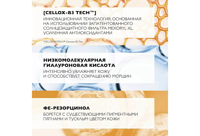 CELLOX-B3 TECHTM : инновационная технология, основанная на использовании запатентованных солнцезащитных фильтров Mexoryl XL , усиленная антиоксидантными свойствами термальной воды La Roche-Posay, витаминами B3 и Е.