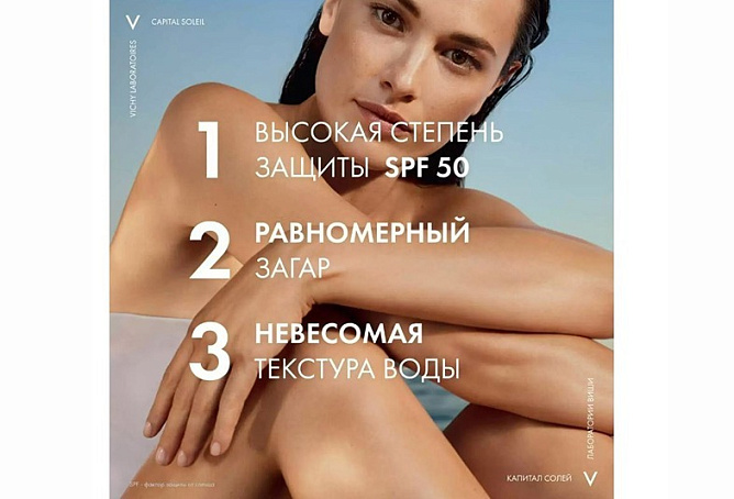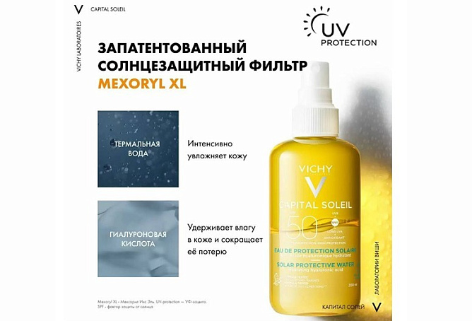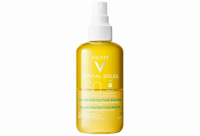 СОЛНЦЕЗАЩИТНАЯ ВОДА ОТ VICHY Средство с высокой защитой от UVA-и UVB-лучей в инновационной* текстуре воды. Лёгкая двухфазная формула с [ГИАЛУРОНОВОЙ КИСЛОТОЙ] и [МИНЕРАЛИЗИРУЮЩЕЙ ТЕРМАЛЬНОЙ ВОДОЙ VICHY] укрепляет защитный барьер кожи и обеспечивает 8 часов интенсивного увлажнения**, оставляя на коже легкий бархатистый финиш. Легко наносится и быстро впитывается. Обладает нелипкой текстурой. Подходит для всех типов кожи, даже для чувствительной. Гипоаллергенно. Протестировано под контролем дерматологов.