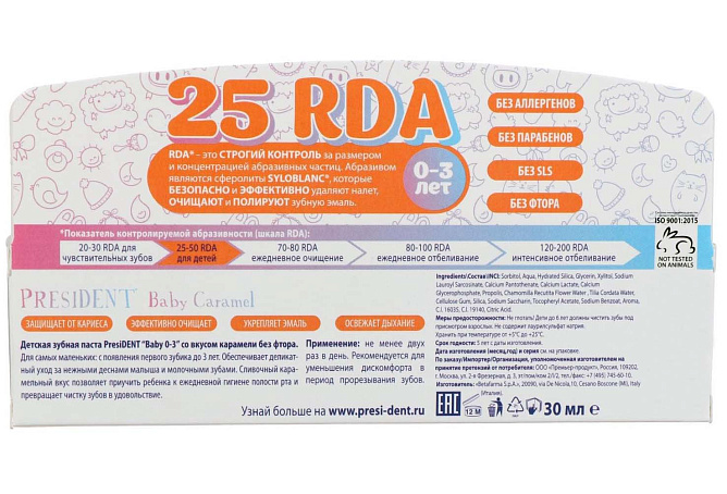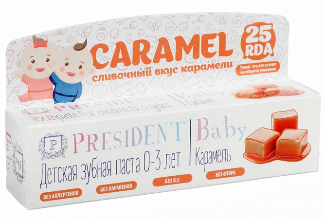 Детская зубная паста PRESIDENT Baby Карамель с RDA 25* для самых маленьких: с появления первого зубика до 3х лет. Зубная паста обеспечивает деликатный уход за нежными деснами малыша и молочными зубами. Сливочный карамельный вкус позволяет приучить ребенка к ежедневной гигиене полости рта и превращает чистку зубов в удовольствие. Зубная паста не содержит фтор, SLS, парабены, аллергены, сахар, безопасна для проглатывания.