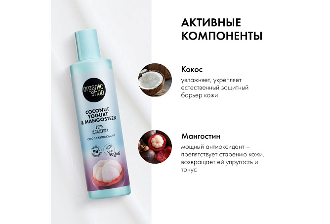 Гель для душа «Омолаживающий» деликатно очищает кожу, восстанавливает и поддерживает ее эластичность. Формула, обогащенная кокосовым йогуртом и органическим экстрактом экзотического мангостина, запускает процесс омоложения кожи за счет придания ей упругости.