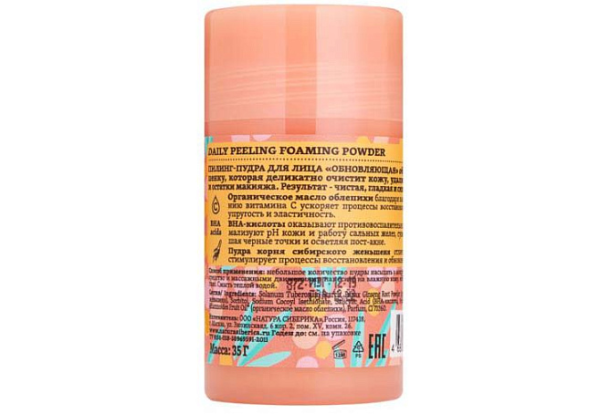 Solanum Tuberosum Starch, Panax Ginseng Root Powder (пудра корня сибирского женьшеня), Sorbitol, Sodium Cocoyl Isethionate, Salicylic Acid (BHA-кислота), Hydrated Silica, Hippophae Rhamnoides Fruit Oil* (органическое масло облепихи), Parfum, CI 73360.