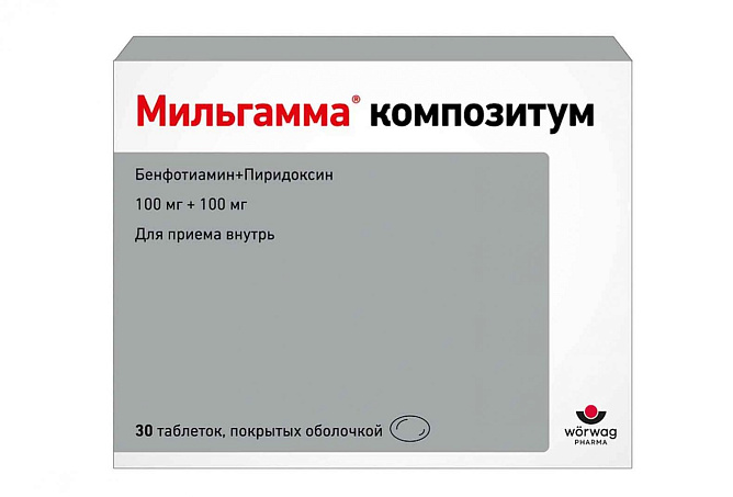 1 таблетка, покрытая оболочкой, содержит: активные вещества: бенфотиамин 100 мг, пиридоксина гидрохлорид 100 мг.