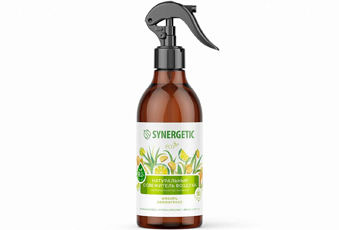 Биоразлагаемый освежитель воздуха, нейтрализатор запахов SYNERGETIC "Имбирь и лемонграсс" на водной основе - это безопасная формула с высокой концентрацией натуральных компонентов.