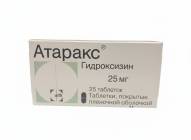 Внутрь. Препарат «Атаракс» следует применять в самой низкой эффективной дозе и в течение как можно более короткого периода времени. Для симптоматического лечения тревожных состояний: от 50 до 100 мг/сут. : от 2 до 4 таблеток по 25 мг в сут. вечером перед сном, если тревожность проявляется главным образом бессонницей. Для симптоматического лечения аллергического зуда: от 30 до 100 мг/сут. : от 1 до 4 таблеток по 25 мг в сут. Для премедикации в хирургической практике: однократно от 1 до 4 таблеток (от 25 до 100 мг) на ночь перед хирургическим вмешательством. Для взрослых и детей с массой тела более 40 кг максимальная суточная доза составляет 100 мг. Врач определяет продолжительность лечения с учетом симптомов и назначает максимально низкую поддерживающую дозу препарата. Поскольку реакции на прием гидроксизина отличаются крайней изменчивостью, рекомендуется начинать лечение с низких доз препарата и постепенно повышать до оптимальной дозы, регулируя ее в соответствии с ответом пациента на терапию. Особые группы пациентов Применение у пожилых пациентов В пожилом возрасте максимальная суточная доза составляет 50 мг. Пациенты с нарушением функции почек Если есть потребность в достижении временного эффекта, дозу можно уменьшить наполовину. Это также применимо для пациентов с почечной недостаточностью. Пациенты с нарушением функции печени: При лечении пациентов с нарушением функции печени рекомендуется снижать суточную дозу препарата на 33%. Пациенты детского возраста (применение у детей в возрасте старше 3 лет) Для симптоматического лечения аллергического зуда: Применение у детей и подростков старше 12 лет (с массой тела более 40 кг): от 30 до 100 мг/сут. : от 1 до 4 таблеток по 25 мг в сут. Применение у детей от 9 до 12 лет (с массой тела от 28 до 40 кг): от 25 до 75 мг/сут. : от 1 до 3 таблеток по 25 мг в сут. Применение у детей от 7 до 9 лет (с массой тела от 23 до 28 кг): от 25 до 50 мг/сут. : от 1 до 2 таблеток по 25 мг в сут. Применение у детей от 4 до 7 лет (с массой тела от 17 до 23 кг): от 25 до 37,5 мг/сут. : от 1 до 1,5 таблеток по 25 мг в сут. Применение у детей в возрасте от 3 до 4 лет (с массой тела от 12,5 до 17 кг): от 12,5 до 25 мг/сут. : от % до 1 таблетки по 25 мг в сут. Доза определяется с учетом массы тела из расчета 1 мг/кг/сут. до максимальной 2 мг/кг/сут., в разделенных дозах. Для детей с массой тела до 40 кг максимальная суточная доза составляет 2 мг/кг/сут. Для детей с массой тела более 40 кг максимальная суточная доза составляет 100 мг. Для премедикации -1 мг/кг на ночь перед анестезией.