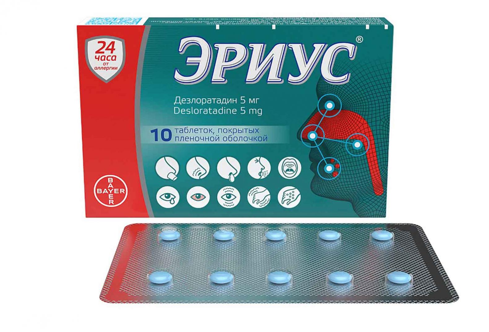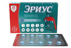 Фармакологическая группа: Противоаллергическое средство – H 1 - гистаминовых рецепторов блокатор Код АТХ R06AX27 Фармакодинамика: Неседативный антигистаминный препарат длительного действия. Является первичным активным метаболитом лоратадина. Подавляет высвобождение гистамина из тучных клеток. Ингибирует каскад реакций аллергического воспаления, в том числе высвобождение провоспалительных цитокинов, включая интерлейкины ИЛ - 4, ИЛ - 6, ИЛ - 8, ИЛ - 13, выделение молекул адгезии, таких как Р - селектин. Таким образом, предупреждает развитие и облегчает течение аллергических реакций, обладает противозудным и противоэкссудативным действием, уменьшает проницаемость капилляров, предупреждает развитие отека тканей, спазма гладкой мускулатуры. Препарат не оказывает воздействия на центральную нервную систему, не вызывает сонливости (применение дезлоратадина в рекомендованной дозе 5 мг в сутки не сопровождается увеличением частоты возникновения сонливости по сравнению с группой плацебо) и не влияет на скорость психомоторных реакций. В клинико - фармакологических исследованиях применения дезлоратадина в рекомендуемой терапевтической дозе не отмечалось удлинения интервала QT на ЭКГ. Действие препарата Эриус® начинается в течение 30 минут после приема внутрь и продолжается в течение 24 часов.