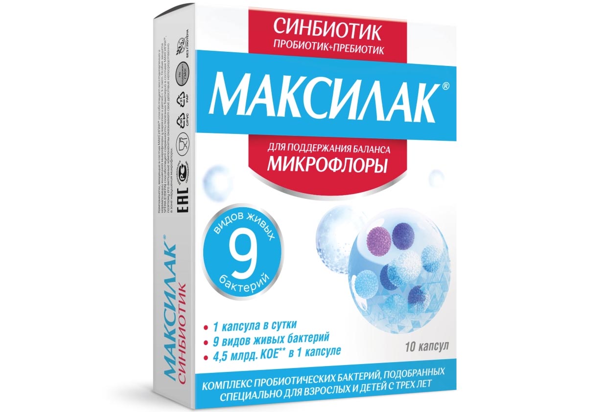 Синбиотик МАКСИЛАК для взрослых и детей с 3 лет представляет собой комплекс из 9 (девяти) пробиотических штаммов в концентрации 4,5 млрд. КОЕ* и пребиотика (фруктоолигосахариды), которые дополняют и усиливают действие друг друга. Кишечная микрофлора выполняет множество различных функции: участвует в пищеварении, обменных процессах, обезвреживании болезнетворных бактерий и поддержании иммунитета, синтезе ряда витаминов и других полезных веществ, необходимых для поддержания здоровья желудочно-кишечного тракта (ЖКТ) и всего организма. Здоровье микрофлоры обеспечивается балансом микроорганизмов, населяющих наш ЖКТ. В норме полезные бактерии составляют более 98% микрофлоры и за счет своей жизнедеятельности сдерживают рост условно-патогенных микроорганизмов. Однако, в определенных ситуациях часть полезных бактерий погибает. Это нарушает равновесие и ведет к появлению ряда неприятных симптомов, таких как диарея, запор, чередование запора и диареи, метеоризм, вздутие и др. может повышаться чувствительность к различным пищевым продуктам или аллергенам. Причиной гибели полезных микроорганизмов могут быть инфекционные заболевания, болезни ЖКТ, неправильное питание, стресс, связанный, например, с изменением географических условий, характера питания, прием ряда лекарственных препаратов (в первую очередь антибиотиков). Для восстановления нормального баланса микрофлоры рекомендованы специальные средства, среди которых наиболее универсальным является синбиотик Максилак®. Синбиотик - комплекс, представляющий собой комбинацию про- и пребиотиков, которые оказывают взаимно усиливающее воздействие на процессы обмена веществ в организме человека. Пробиотики — это живые микроорганизмы, оказывающие благоприятное воздействие на организм благодаря нормализации состава или повышению активности нормальной микрофлоры кишечника. Входящие в состав Максилак лакто- и бифидобактерии (пробиотический компонент) подавляют рост различных видов болезнетворных бактерий, восстанавливая равновесие кишечной микрофлоры, улучшают обменные процессы, укрепляют иммунитет, повышают сопротивляемость организма простудным и инфекционным заболеваниям. Эффективность пробиотиков, включающих несколько различных штаммов лакто- и бифидобактерий достигается за счет синергизма входящих в их состав компонентов. Молочная кислота, синтезируемая лактобактериями, препятствует росту патогенной флоры, а также способствует усвоению витамина Д, железа, кальция. Пребиотики - пищевые ингредиенты, обладающие благоприятным воздействием на организм человека в результате избирательной стимуляции роста и/или повышения биологической активности нормальной микрофлоры кишечника. Фруктоолигосахариды (пребиотик в составе Максилак) снабжают пробиотические бактерии энергией и питательными веществами, стимулируя в 1,5-2 раза более быстрое их размножение. Фруктоолигосахариды улучшают и нормализуют работу кишечника, стимулируют перистальтику, служат для профилактики запоров и диареи, способствуют нормализации функций всего ЖКТ. Бактерии, входящие в состав Максилак, поставляются мировым лидером по производству пробиотиков, проходят регулярный контроль генетической чистоты, что служит гарантией высокого качества и стабильности бактериальных штаммов. Запатенто